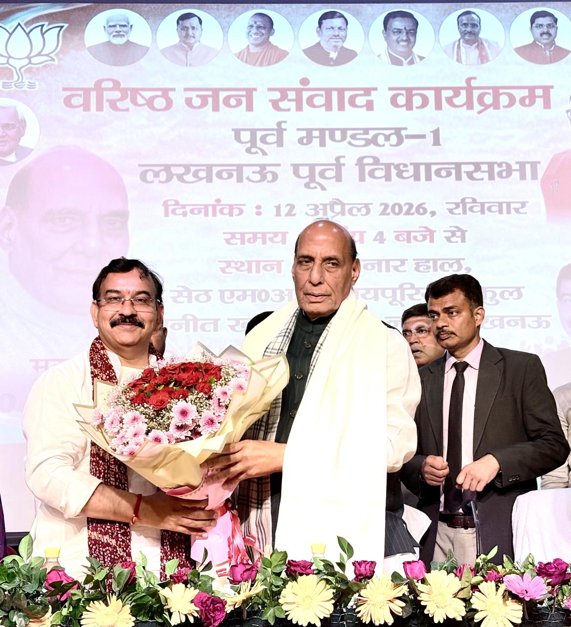 लखनऊ वरिष्ठ जन संवाद कार्यक्रम में पहुंचे रक्षा मंत्री राजनाथ सिंह का भाजपा महानगर अध्यक्ष आनंद द्विवेदी द्वारा किया गया स्वागत